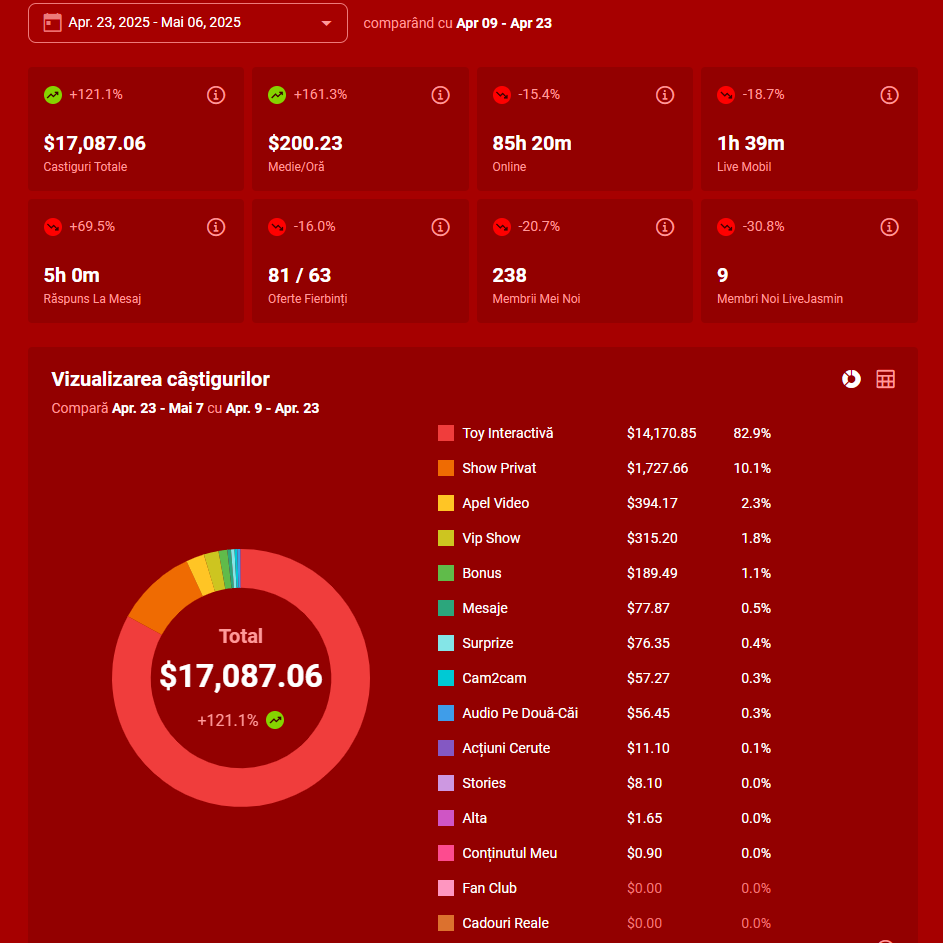 Modelele noastre câștigă între 5,000 și 40,000 de dolari lunar, însă nu există un răspuns general la această întrebare. Sunt modele care câștigă 4-5 mii, altele zeci de mii, iar vârfurile (modelele de top) pot ajunge să depășească și suta de mii.