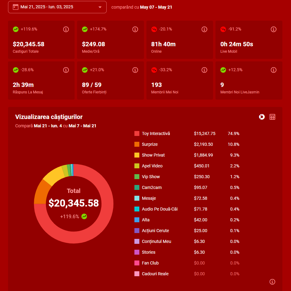 Modelele noastre câștigă între 5,000 și 40,000 de dolari lunar, însă nu există un răspuns general la această întrebare. Sunt modele care câștigă 4-5 mii, altele zeci de mii, iar vârfurile (modelele de top) pot ajunge să depășească și suta de mii.