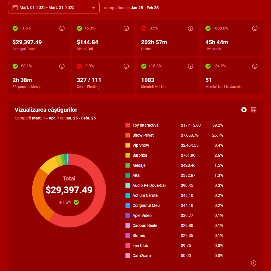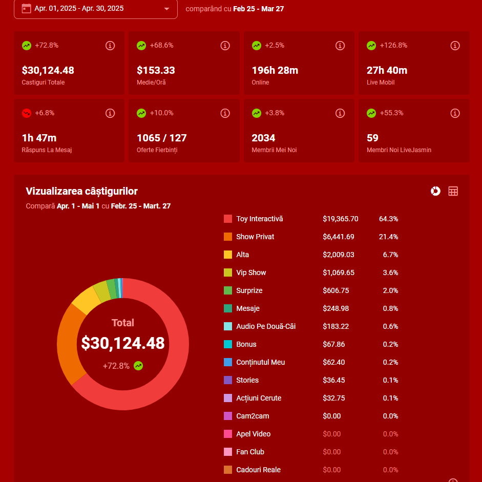 Modelele noastre câștigă între 5,000 și 40,000 de dolari lunar, însă nu există un răspuns general la această întrebare. Sunt modele care câștigă 4-5 mii, altele zeci de mii, iar vârfurile (modelele de top) pot ajunge să depășească și suta de mii.